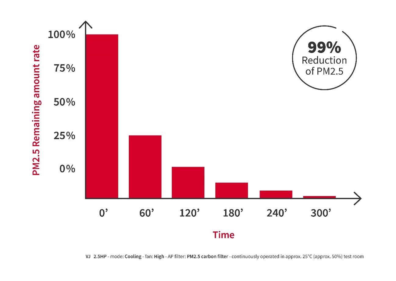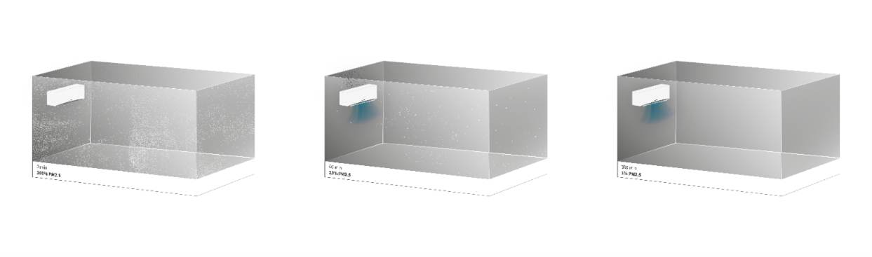 After 300 minutes of cooling operation, the quantity of PM2.5 particulate matters in the room had decreased by 99%!